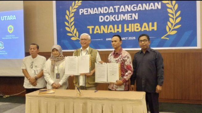 Tandaseru – Pemerintah Daerah Kabupaten Halmahera Timur resmi menyerahkan hibah lahan kepada Perum BULOG melalui penandatanganan Naskah Perjanjian