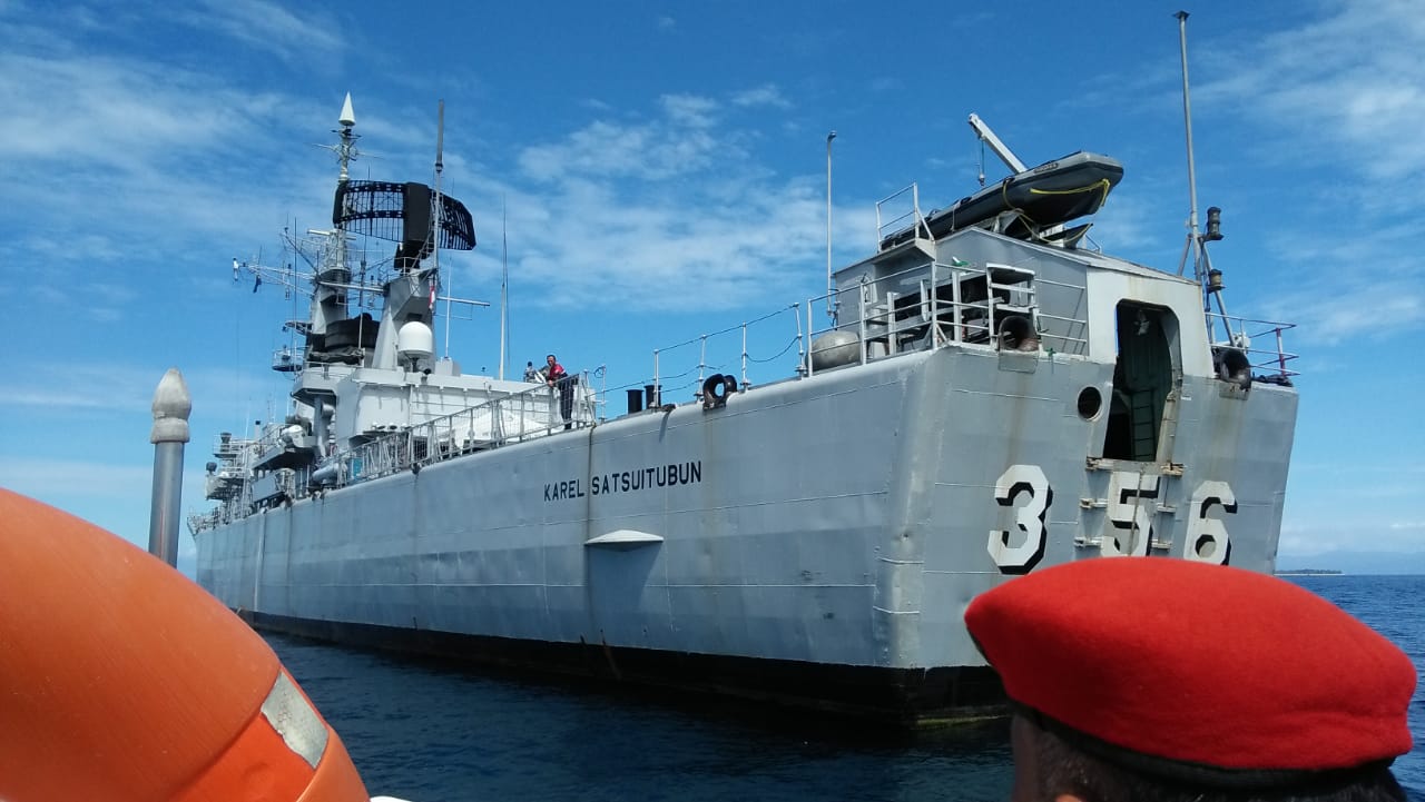 Tandaseru — Kapal Perang Republik Indonesia (KRI) Tentara Nasional Indonesia Angkatan Laut Karel Satsuit Tubun (KST) 356 berlabuh di perairan laut Kabupaten Pulau Morotai, Provinsi Maluku Utara, Rabu (19/8). Kedatangan KRI tersebut dalam rangka Operasi Manggala Yudha 20.