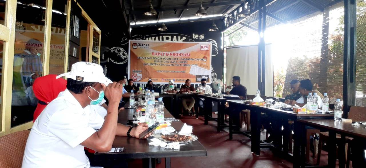 Tandaseru — Komisi Pemilihan Umum (KPU) Kepulauan Sula, Maluku Utara menggelar rapat koordinasi persiapan pendaftaran bakal pasangan calon bupati dan wakil bupati Kabupaten Kepulauan Sula di Waiback Coffee, Desa Man Gega, Kecamatan Sanana Utara, Kamis (3/9).