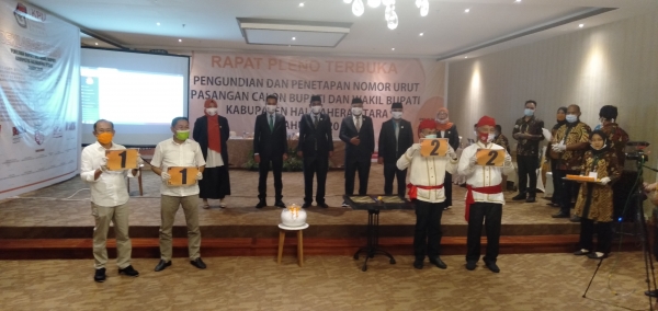 Tandaseru — Komisi Pemilihan Umum Kabupaten Halmahera Utara, Maluku Utara melakukan pengundian sekaligus pleno penetapan nomor urut pasangan calon yang bertarung pada Pilkada 2020. Bertempat di Hotel Marahai Park Desa Wosia Kecamatan Tobelo Tengah, pengundian berjalan lancar dan tertib.