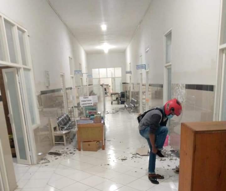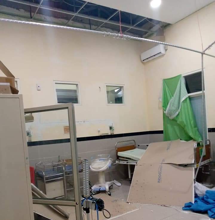 Para pasien tampak diinfus di bawah tenda seadanya. Sementara bangunan rumah sakit mengalami retak di sana-sini dan hancur di beberapa tempat. Plafon bangunan juga runtuh di sejumlah ruangan.