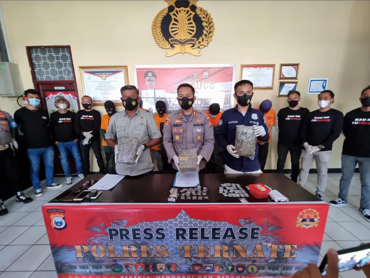 “Dari dua tersangka ditemukan barang bukti sebayak 3 saset berukuran besar berisi ganja dengan berat 2,4 kilogram,” kata Kapolres Ternate, AKBP Aditya Laksimada dalam konferensi pers di Mapolres Ternate, Kamis (27/5).