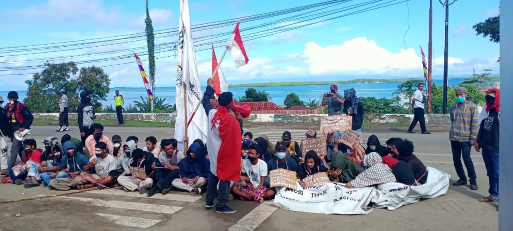Dipimpin Fikram Djakaria, massa aksi membentangkan spanduk bertuliskan “Mosi Tidak Percaya terhadap Pemda Kabupaten Pulau Morotai”.