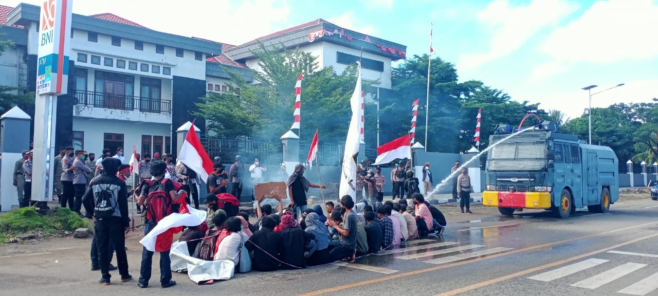 Massa aksi kemudian dibubarkan oleh aparat kepolisian Polres Morotai menggunakan water canon dan menembakkan gas air mata. Massa aksi lantas bubar berhamburan. Sementara ada dua massa aksi yang diamankan di Mako Polres Pulau Morotai karena ketahuan membawa batu.