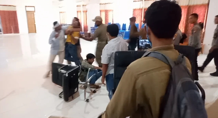 Tandaseru — Aktivis Hippmamoro Maluku Utara membanting meja dan kursi saat hearing soal sengketa lahan bersama anggota DPRD Pulau Morotai di ruang paripurna lantai ll, Senin (29/11).