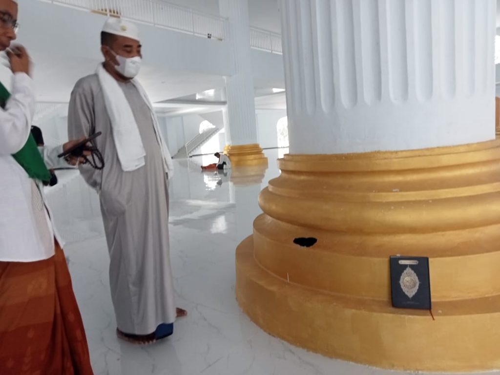 Salah satu pengurus masjid mengaku bolong itu disebabkan adanya Alquran yang jatuh menimpa ornamen tiang.