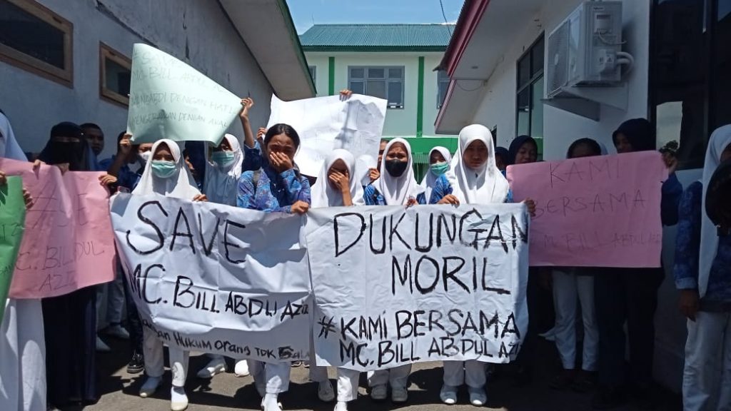 Spanduk dan pamflet yang dibawa siswa bertuliskan “Save McBill Abdul Aziz” dan “Jangan hukum orang tidak salah, dukung moril kami bersama McBill Abdul Aziz”.