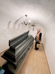 Begitu masuk, Chmielewski menawarkan melihat ruang bawah tanah gereja, tempat jenazah Uskup Wierzbowski diletakkan. Didorong rasa penasaran dan ingin tahu, satu per satu kami menuruni tangga menuju ruang bawah tanah.