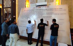 Kegiatan pun diselingi dengan penandatanganan ikrar kampanye bermartabat “Harmoni Tanpa Politik Uang” di Provinsi Maluku Utara, kemudian penyerahan plakat deklarasi oleh Bawaslu Provinsi Maluku Utara kepada para paslon.