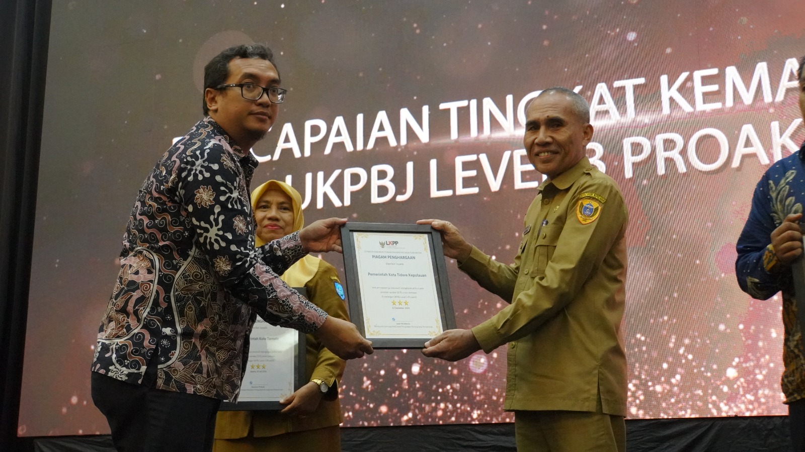 Tandaseru — Pemerintah Daerah Kota Tidore Kepulauan menerima penghargaan dari Lembaga Kebijakan Pengadaan Barang/Jasa Pemerintah (LKPP) atas pencapaian dalam memenuhi kelengkapan atribut pada sembilan variabel, untuk mencapai Kematangan Unit Kerja Pengadaan Barang/Jasa (UKPBJ) Level 3 Proaktif.