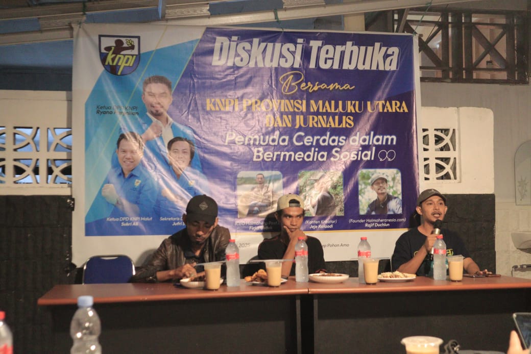 Penyampaian materi melalui diskusi bersama KNPI Provinsi Maluku Utara dan jurnalis itu dihelat Sabtu (11/1/2025) malam di The Cogan Cafe, Skep Pohon Amo, Kelurahan Makassar Barat. Kegiatan yang diinisiasi Bidang Komunikasi, Publikasi dan Media Sosial itu bertema “Pemuda Cerdas dalam Bermedia Sosial”.