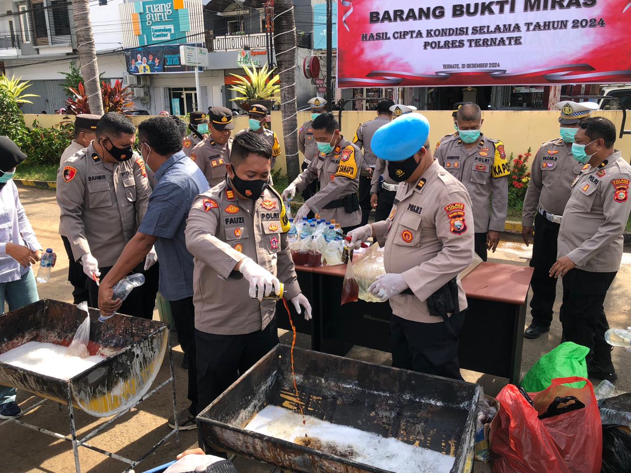 Tandaseru — Sepanjang tahun 2024, Polres Ternate, Maluku Utara, memusnahkan ribuan liter minuman keras berbagai merek yang dikemas dalam kantong plastik, botol hingga jerigen. Barang bukti tersebut dimusnahkan di hari terakhir tahun 2024.