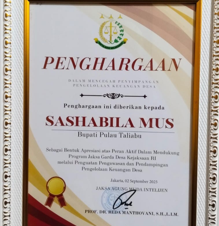 Tandaseru – Bupati Pulau Taliabu, Maluku Utara, Sashabila Widya L Mus, dianugerahi penghargaan oleh Kejaksaan Agung Republik Indonesia atas perannya mendukung program pengawasan keuangan Dana Desa. Penghargaan tersebut diberikan sebagai bentuk apresiasi atas komitmennya mencegah potensi penyimpangan dalam pengelolaan Dana Desa di Kabupaten Pulau Taliabu.