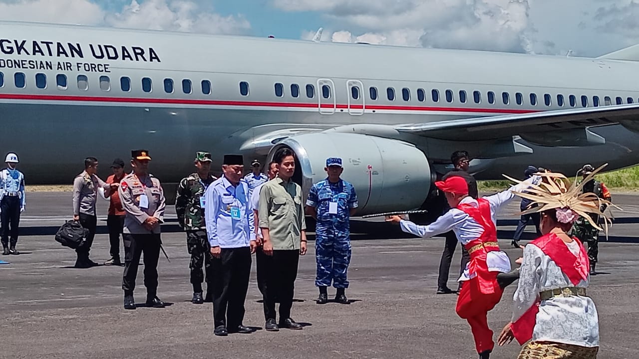 Gibran bersama rombongan tiba pukul 12.40 WIT di Bandara Leo Wattimena disambut langsung Wakil Gubernur Sarbin Sehe, Kapolda Irjen Pol Waris Agono, Danrem 152/Baabullah Brigjen TNI Enoh Solehudin, Kabinda Malut Laksmana TNI Moch. Hamzah Soerjo Widodo, dan Bupati Pulau Morotai Rusli Sibua. RI 02 menggunakan pesawat TNI AU Boing 737 reg A-7309.