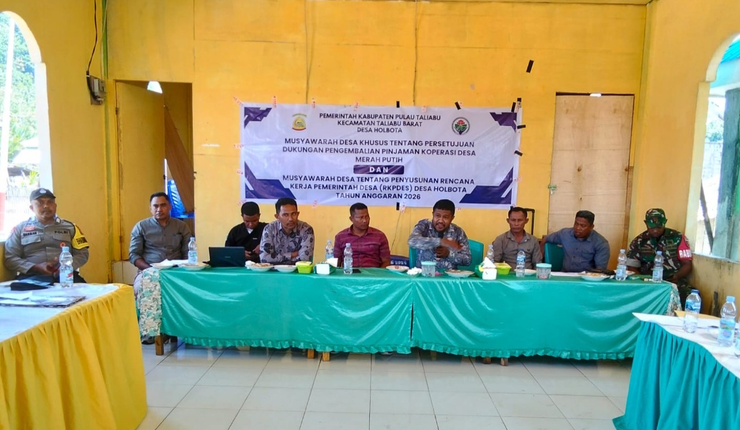 Tandaseru – Pemerintahan desa Holbota, kabupaten Pulau Taliabu, Maluku Utara, menggelar Musyawarah Desa (Musdes) Khusus tentang persetujuan dukungan pengembalian pinjaman Koperasi Desa (KOPDes) Merah Putih dan Musdes Rencana Kerja Pemerintah Desa (RKPDes) Tahun Anggaran 2026, Minggu (19/10/2025).