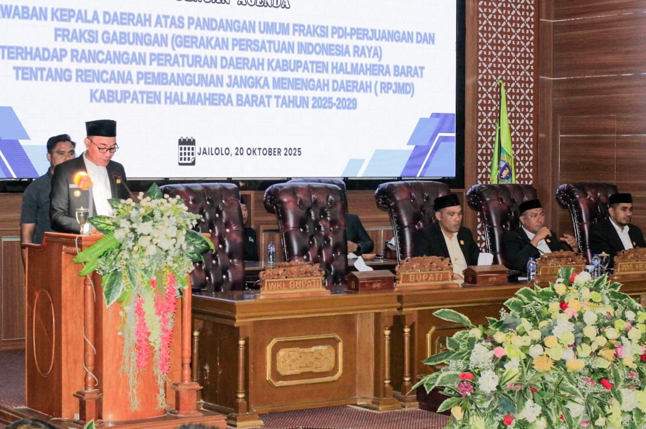 Tandaseru — DPRD Halmahera Barat, Maluku Utara, menggelar Paripurna penyampaian jawaban resmi pemerintah daerah terkait pandangan umum Fraksi PDI-P dan Fraksi Gabungan (Gerindar-Perindo) tentang Rencana Pembangunan Jangka Menengah Daerah (RPJMD) 2025-2029, Senin (20/10/2025).