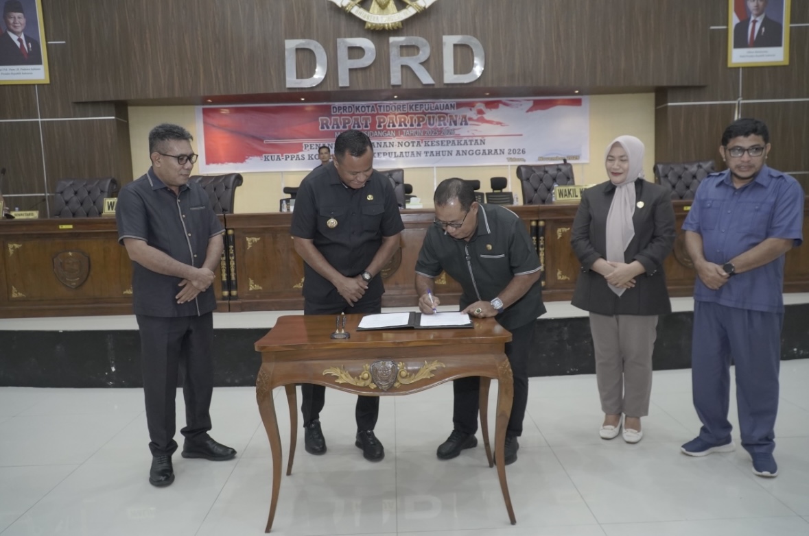Tandaseru — Pemerintah Kota Tidore Kepulauan, Maluku Utara, dan Dewan Perwakilan Rakyat Daerah (DPRD) Kota Tidore Kepulauan menandatangani Nota Kesepakatan Kebijakan Umum Anggaran (KUA) serta Prioritas Plafon Anggaran Sementara (PPAS) Tahun Anggaran 2026.