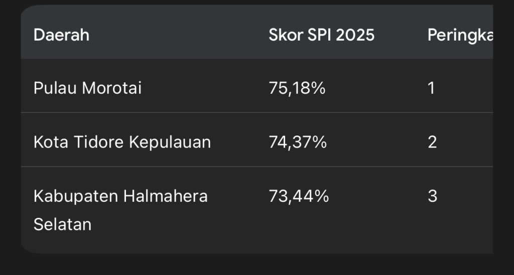 Berdasarkan hasil SPI 2025, Kabupaten Pulau Morotai menduduki urutan pertama se-Provinsi Maluku Utara dengan perolehan skor sebesar 75,18%.