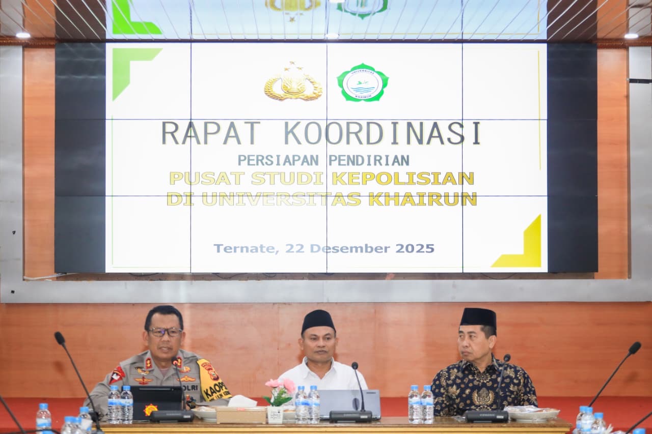 Tandaseru — Universitas Khairun (Unkhair) bersama Polda Maluku Utara menggelar rapat koordinasi (rakor) membahas rencana pendirian Pusat Studi Kepolisian. Rapat tersebut bertempat di Ruang Senat Universitas, Rektorat Kampus II Unkhair, Ternate, Senin (22/12/2025).