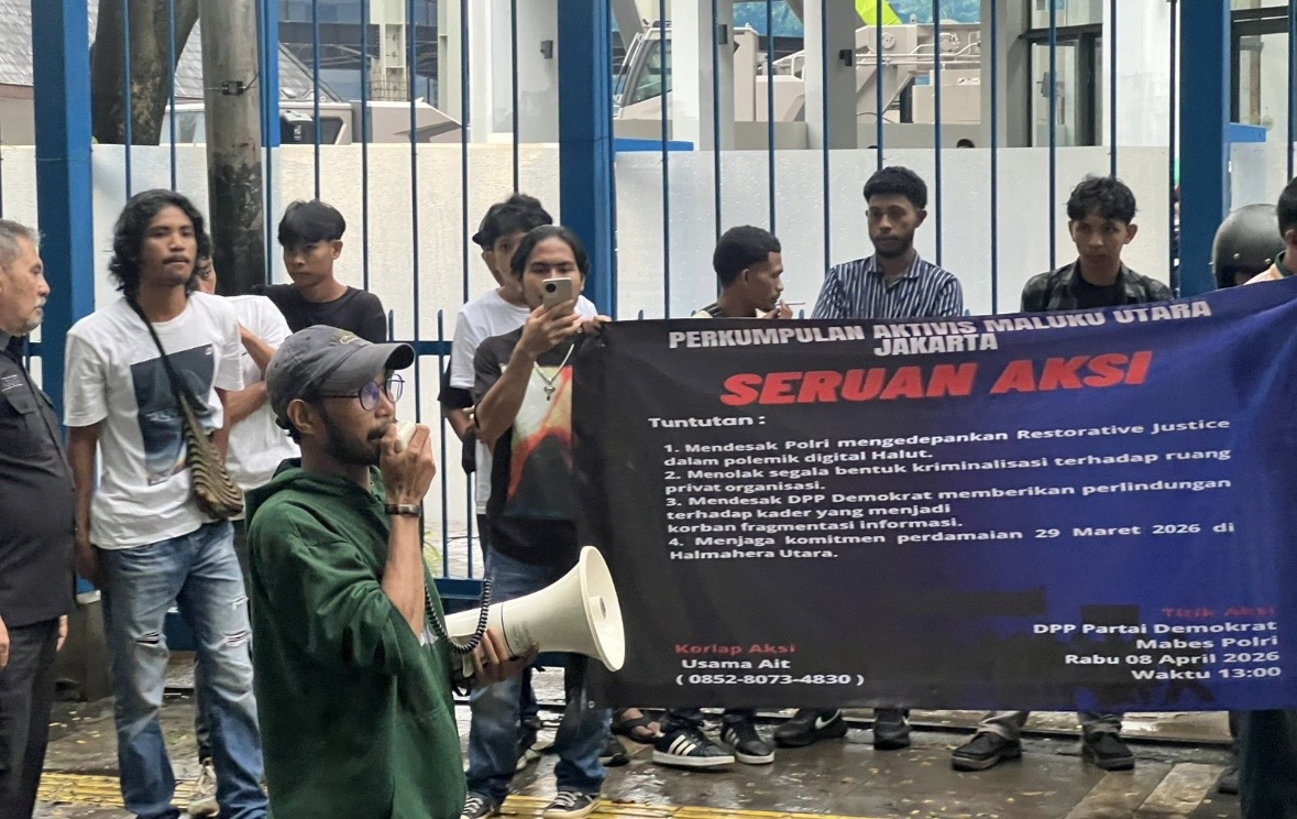 Tandaseru — Sejumlah massa yang tergabung dalam Perkumpulan Aktivis Maluku Utara (PA-Malut) Jakarta menggelar aksi unjuk rasa di depan Kantor DPP Partai Demokrat, Rabu (8/4/2026). Massa mendesak pengurus pusat partai untuk turun tangan memberikan perlindungan hukum bagi kadernya, Aksandri Kitong, yang dinilai menjadi korban manipulasi informasi digital.