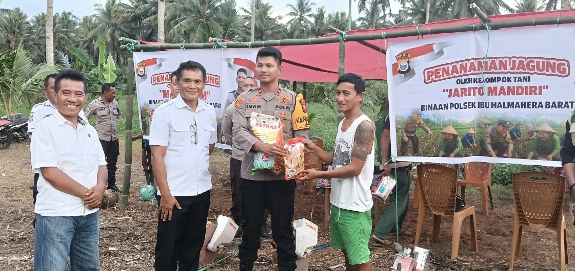 Selain melakukan penanaman simbolis, Kapolsek Ibu menyerahkan bantuan bibit jagung kepada para petani. Bantuan ini merupakan langkah konkret kepolisian mendorong produktivitas sektor pertanian lokal.
